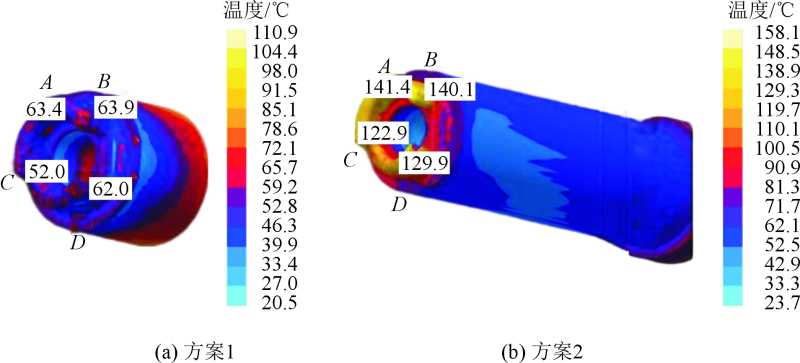 圖3 同類型鑄件的缺陷圖 同類型鑄件連接濾清器局部燒傷缺陷是模具的熱量過高導致,而安裝面的氣孔缺陷是鋁液內含氣量過高造成,兩種缺陷造成的因素相互獨立,所以先用Magma軟件模擬金屬3D打印隨形冷卻鑲件和傳統冷卻鑲件對燒傷缺陷的影響效果,然后在冷卻效果比較好的能解決濾清器局部燒傷缺陷的鑲件基礎上再做一個抽真空與否的模擬對比,從而得出最優的解決缺陷的組合方案。 初步確定采用金屬3D打印工藝制造隨形冷卻水道的鑲件,提高冷卻效率以解決燒傷缺陷。為了保證設計的有效性,使用CAD設計了兩套方案。圖4為隨形冷卻鑲件與傳統冷卻鑲件圖,藍色為冷卻水道。在Magma模擬軟件導入兩種鑲件的壓鑄方案進行模擬仿真。通過模擬結果對比,分析兩種方案對風險位置的影響,從而判定金屬3D打印隨形冷卻鑲件的方案對解決鑄件連接濾清器局部的燒傷缺陷是否可行。圖5為兩個方案的鑲件溫度模擬對比圖,表1為兩個方案的鑲件取點溫度對比數據表。從仿真軟件顯示的鑲件溫度分析,鋁液在型腔100%填充后,通過鑲件成形位置的取點測量可知方案1比方案2的溫度低,溫度數據差值平均低約73.3 ℃。