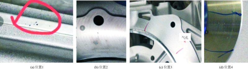 圖9 模具冷卻系統(tǒng) 根據(jù)模具的設(shè)計(jì)匹配,使用16 000 kN意德拉壓鑄機(jī)進(jìn)行生產(chǎn),沖頭直徑選擇120 mm,壓射有效行程為620 mm,通過(guò)內(nèi)澆口的鋁液質(zhì)量為6.15 kg,理論高速位置設(shè)置為380 mm,壓射沖頭高度速度為4 m/s,增壓位置設(shè)置為560 mm,以此作為調(diào)試生產(chǎn)的基礎(chǔ)參數(shù)。機(jī)臺(tái)周邊配備全自動(dòng)生產(chǎn)設(shè)備,能有效保證生產(chǎn)過(guò)程的穩(wěn)定性。在實(shí)際生產(chǎn)調(diào)試時(shí),適當(dāng)調(diào)整高速位置驗(yàn)證產(chǎn)品質(zhì)量,最終采用高速位置為420 mm、高速速度為4.2 m/s、增壓位置為560 mm時(shí),產(chǎn)品質(zhì)量理想,但通過(guò)X射線探傷檢測(cè),發(fā)現(xiàn)局部仍存在氣孔不穩(wěn)定的情況。產(chǎn)品的氣孔狀況見(jiàn)圖10。 產(chǎn)品內(nèi)部氣縮孔標(biāo)準(zhǔn):位置1在澆注的最尾端壁厚小于9.5 mm;位置2~4局部壁厚超過(guò)9.5 mm,局部按照鋁合金壁厚與氣孔等級(jí)為2級(jí)標(biāo)準(zhǔn);加工后外觀標(biāo)準(zhǔn):位置1和4,小于?0.25 mm的非連接氣孔無(wú)數(shù)量限制,小于?2 mm×2 mm深的非連接孔,每100 mm長(zhǎng)度最多2個(gè);位置2和3,小于?0.25 mm的非連接氣孔無(wú)數(shù)量限制,小于?1 mm×1 mm深的非連接氣孔,每100 mm長(zhǎng)度最多2個(gè)。可以看出,加工后外觀標(biāo)準(zhǔn)比內(nèi)部標(biāo)準(zhǔn)更加嚴(yán)格,按照此狀態(tài)生產(chǎn)并進(jìn)行CNC加工檢驗(yàn),發(fā)現(xiàn)X光檢測(cè)有氣孔的位置均有部分產(chǎn)品氣孔加工外露(見(jiàn)圖11),因此針對(duì)產(chǎn)品氣孔需要進(jìn)一步改善。