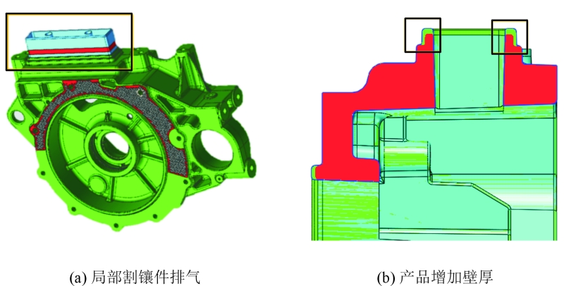 圖11 產(chǎn)品加工氣孔外露結(jié)果 方形孔局部結(jié)構(gòu)見(jiàn)圖12。方框孔在澆排的水尾位置,處于產(chǎn)品的中間,局部方框壁厚為2.8 mm,因周邊無(wú)法在方框孔周邊布置渣包,局部的氣體難以排出,同時(shí)產(chǎn)品的壁厚相對(duì)產(chǎn)品整體偏薄,所以鋁料的局部流動(dòng)性相對(duì)較差,易有冷料堆積。 針對(duì)產(chǎn)品的排氣與減少冷料的堆積,分析可知,采用渣包排氣、排渣是最有效的方式。受產(chǎn)品結(jié)構(gòu)限制,無(wú)法直接增加渣包,所以采用多方式綜合解決。圖13為方框孔側(cè)壁氣孔改善措施。措施1是將沿氣孔加工外露的側(cè)壁進(jìn)行割鑲件處理(見(jiàn)圖13a),利用模具鑲塊的配合分型面進(jìn)行排氣;措施2是產(chǎn)品局部壁厚加厚至3.8 mm(見(jiàn)圖13b),通過(guò)局部加厚加強(qiáng)鋁液填充的流動(dòng)性,從而改善冷料局部堆積。綜合措施實(shí)施后,發(fā)現(xiàn)局部氣孔改善良好,滿足產(chǎn)品品質(zhì)要求。