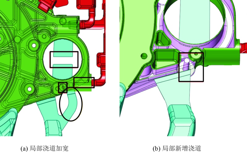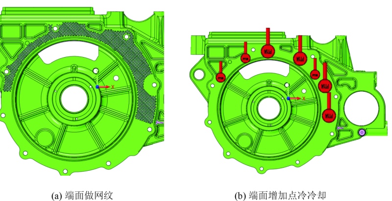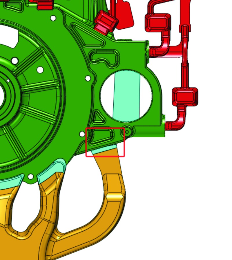 圖13 方形孔側(cè)壁氣孔改善措施 加工位置2和3氣孔,在產(chǎn)品的同一面上,見(jiàn)圖14,在產(chǎn)品澆排系統(tǒng)的水尾側(cè),同時(shí)也是壁厚相對(duì)較厚的位置。針對(duì)產(chǎn)品的厚壁位置,一般局部凝固較慢,當(dāng)周邊的壁薄位置凝固,就斷開(kāi)了局部的補(bǔ)縮通道,內(nèi)部容易產(chǎn)生縮松。另外根據(jù)生產(chǎn)顯示內(nèi)部氣孔品質(zhì)符合標(biāo)準(zhǔn)要求,只是加工導(dǎo)致的氣孔外露不符合標(biāo)準(zhǔn),因此,改善方向主要朝避免外露的方向解決。 針對(duì)產(chǎn)品加工面外露且在水尾問(wèn)題,網(wǎng)紋對(duì)浮面的氣孔能夠起到排氣及冷料的效果,改善方法1是在局部端面增加網(wǎng)紋,但改善效果并不明顯,因此需要針對(duì)厚壁位置的縮松,采用局部增加擠壓,在產(chǎn)品未完全凝固時(shí),采用擠壓銷針進(jìn)行補(bǔ)縮。這種方式理論可行,但產(chǎn)品密集型氣孔相對(duì)較分散,單個(gè)擠壓銷無(wú)法覆蓋全局,多個(gè)擠壓銷針又不太現(xiàn)實(shí),因此方案不可行;考慮采用降低局部模溫,改善方法2是在外露的端面增加點(diǎn)冷,加強(qiáng)局部冷卻凝固,減輕局部的縮松,同時(shí),降低模具表面溫度,使產(chǎn)品表面擁有更厚的致密層,從而減少加工外露的風(fēng)險(xiǎn)。圖15為電機(jī)配合面氣孔改善措施。 加工位置4的氣孔,檢查產(chǎn)品加工余量為0.6~0.8 mm,符合產(chǎn)品的正常加工余量,同時(shí)周邊壁厚約為12 mm,氣孔在澆排的入料口位置,不存在末端冷料無(wú)法排除問(wèn)題,孔內(nèi)也布置了運(yùn)水結(jié)構(gòu),改善其厚壁位置的冷卻導(dǎo)致的縮松。根據(jù)對(duì)產(chǎn)品澆排的進(jìn)一步分析,該位置雖有一條澆道,但其正對(duì)產(chǎn)品減料位,見(jiàn)圖16,阻礙了鋁液對(duì)局部的填充,因此局部位置氣孔可能是鋁液填充不足引起。 針對(duì)鋁液填充不足,同時(shí)減小動(dòng)模具及改動(dòng)澆注系統(tǒng),選擇加強(qiáng)半軸孔位置的進(jìn)料。方法1為對(duì)局部澆道內(nèi)澆口進(jìn)行加寬,寬度超過(guò)對(duì)應(yīng)的減料槽,結(jié)果導(dǎo)致產(chǎn)品直沖定模芯針,芯針沖擊受熱后周邊縮孔出現(xiàn),同時(shí)芯針斷針頻繁,模具故障率升高;方法2為直接避開(kāi)定模芯針與動(dòng)模抽芯針,在其之間增加一股澆道,同時(shí)斷開(kāi)過(guò)料防止鋁液直接沿過(guò)料搭橋產(chǎn)生回流包卷,改進(jìn)措施見(jiàn)圖17。將澆口及搭橋按照方法2改善后,半軸孔的氣孔改善顯著。