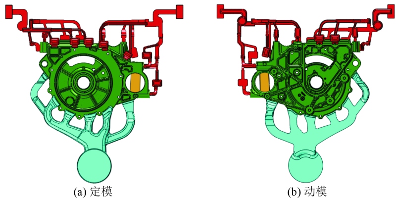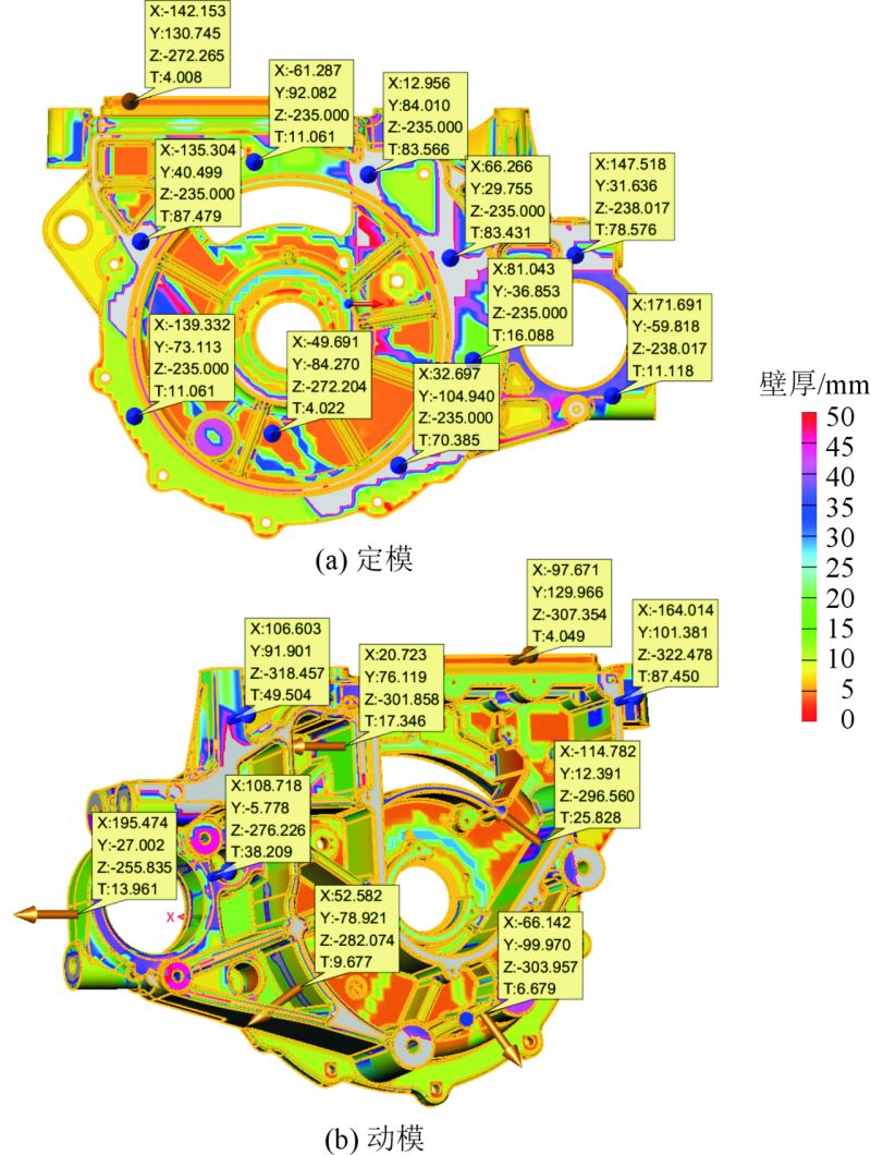 圖1 電機(jī)殼后端蓋產(chǎn)品示意圖 根據(jù)產(chǎn)品的結(jié)構(gòu)分析,選擇合適的動(dòng)定模分型。另外,產(chǎn)品側(cè)面分兩個(gè)方向出模,即模具需要設(shè)計(jì)2個(gè)抽芯滑塊進(jìn)行分模,產(chǎn)品動(dòng)定模分型及滑塊分型,從而保證產(chǎn)品的正常出模生產(chǎn)。圖2為電機(jī)殼后端蓋分形設(shè)計(jì)。圖3為電機(jī)殼后端蓋壁厚分析。根據(jù)產(chǎn)品壁厚,以產(chǎn)品定模側(cè)進(jìn)行分析,左側(cè)局部小面積壁厚較厚,右半邊整體壁厚較厚(見(jiàn)圖3a),以產(chǎn)品動(dòng)模側(cè)分析,動(dòng)模整體為筋條結(jié)構(gòu),厚壁筋條主要體現(xiàn)在左邊(見(jiàn)圖3b),因此,產(chǎn)品兩側(cè)壁厚極不均勻。為保證壁厚位置有足夠的鋁料填充,需要加強(qiáng)壁厚位置的澆口布局。