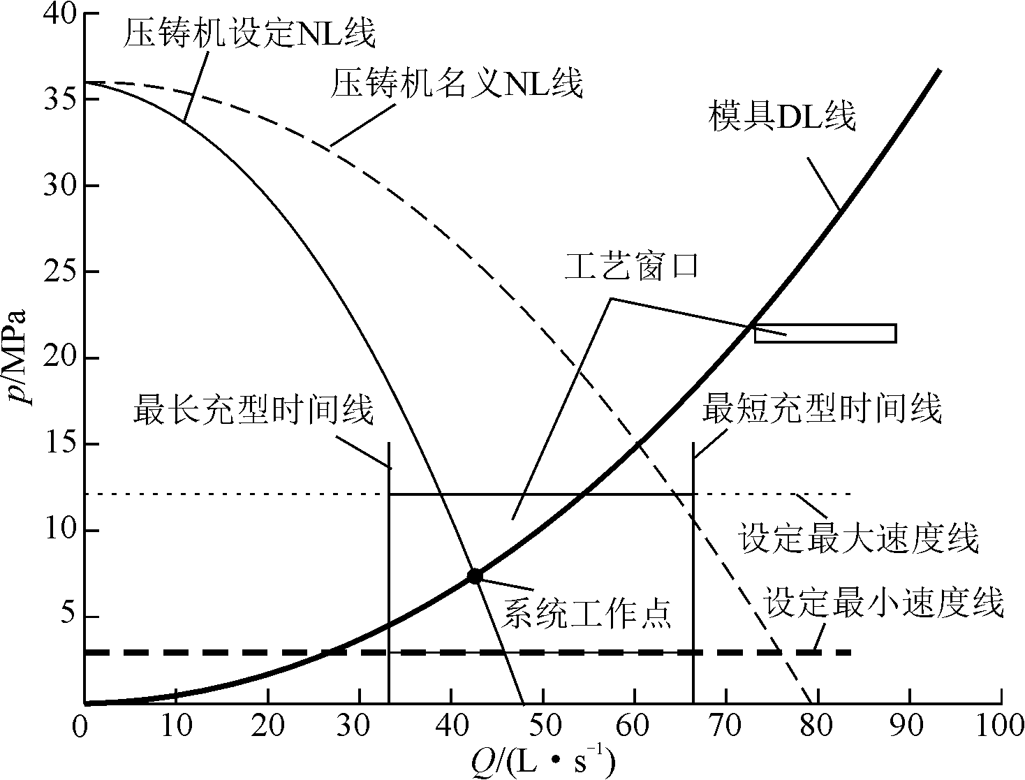 圖3 電機(jī)殼后端蓋壁厚分析 澆排的設(shè)計(jì)重點(diǎn)在于進(jìn)澆口的選擇,一般需要根據(jù)鑄件的形狀、結(jié)構(gòu)、精度要求確定澆口的位置和形式。根據(jù)對(duì)該產(chǎn)品結(jié)構(gòu)分析,產(chǎn)品可在滑塊1側(cè)及其對(duì)側(cè)進(jìn)澆,但根據(jù)產(chǎn)品的關(guān)鍵位置,除產(chǎn)品的電機(jī)配合面涉及整個(gè)產(chǎn)品外圍不受影響,軸承孔與半軸孔在遠(yuǎn)離滑塊1側(cè),接線盒蓋板安裝面在動(dòng)模側(cè)滑塊背面受滑塊1擋料影響,因此選擇將澆口布置在滑塊1的對(duì)立側(cè),保證進(jìn)澆位置離軸承孔與半軸孔近,接線盒蓋板安裝面不受滑塊1擋料影響。內(nèi)澆口布局,滑塊1對(duì)立側(cè)的加工端面布置4個(gè)內(nèi)澆口,兩側(cè)的非加工位置再各布局1個(gè)內(nèi)澆口加強(qiáng)兩側(cè)的充型,同時(shí)產(chǎn)品靠外側(cè)的圓孔中間設(shè)置搭橋過(guò)料,最終澆排系統(tǒng)設(shè)計(jì)方案見(jiàn)圖4。 采用Magma模擬分析,模流分析初始條件設(shè)置見(jiàn)表1,并采用p-Q圖校核相關(guān)工藝的合理性,相關(guān)工藝設(shè)置合理見(jiàn)圖5。