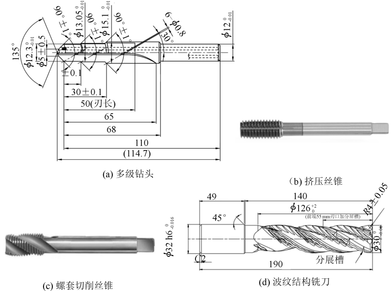 圖10 前艙鑄件的機加工刀具形式 通過加工試驗并檢測,雙梁雙主軸五軸龍門加工中心、機器人切削單元在加工的鑄件孔、螺紋等特征外觀質量符合標準要求,見圖11。但在加工鑄件的面上,單梁單主軸五軸龍門加工中心方案與雙梁雙主軸五軸龍門加工中心方案,加工前艙鑄件外觀以及尺寸精確均達到了標準要求,而采用機器人切削單元設備方案加工所得到的加工面外觀卻存在著明顯的起級以及振紋。這主要是由于該方案中的主軸剛性相對較差,使得機器人在進行端面加工的過程中,無法保持穩定的切削狀態,從而產生刀紋以及振紋,嚴重影響了加工件的質量。