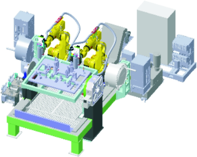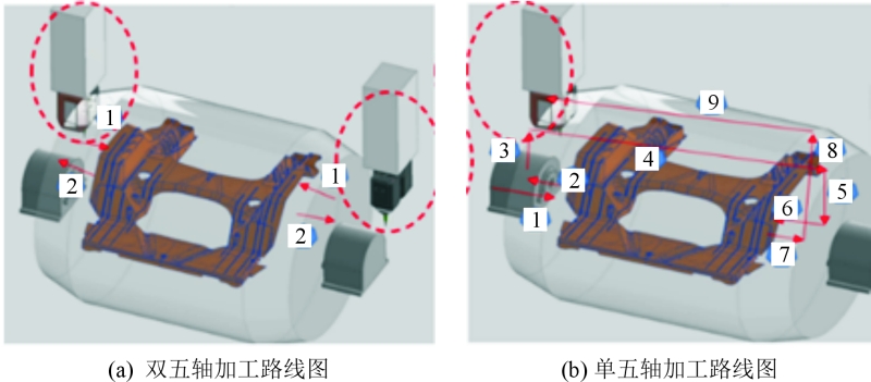 圖2 龍門五軸加工中心的形式及加工路線圖(數字為主軸沿著箭頭路線移動的順序) (2)機器人切削加工單元方案 此方案的創新之處在于通過機器人手爪配置主軸系統來抓取刀具對產品進行切削加工,并使用2個機器人手爪完成銑削等作業,見圖3。其優勢主要體現在設備價格相對較低、柔性好以及制造周期短等方面。