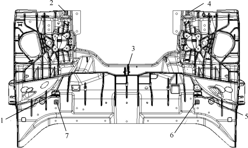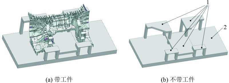 圖3 雙機器人切削加工單元 XY平面方向定位:前艙鑄件外形尺寸巨大,相比傳統的壓鑄件,鑄件的變形量也較大。經過壓鑄模擬分析,發現在壓鑄工藝的中部區域以及前端部位,鑄件的變形程度相對較小,即便存在變形情況,也主要表現為從中間向輪轂兩端的方向輕微拉長。圖4為前艙鑄件的機加工定位示意圖。 前艙鑄件的尺寸較大,為1 650 mm×950 mm×630 mm,這給相關的夾具設計帶來了全新的挑戰。按照傳統的夾具設計模式來進行設計,夾具的質量將會增大,甚至可能達到2.5 t。然而, CNC設備的第6軸轉臺的承重能力最大僅為1.2 t。這說明按照傳統方式設計的夾具質量將遠超過轉臺的承重能力,從而無法進行正常的加工操作。為了克服這一難題,需要對前艙鑄件的夾具整體框架結構進行輕量化設計,通過夾具鏤空減重技術,將夾具質量控制在1 t左右。根據夾緊位置和輔助支撐位置,確定出夾具的大致構造,見圖5,由1個基座和5個平臺構成。對圖5的結構進行一階模態分析和施加載荷進行拓撲優化,結果見圖6。
