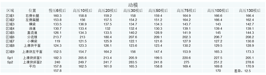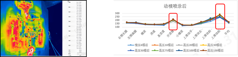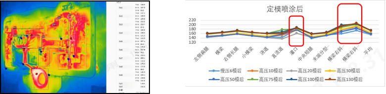 以上都是取的噴涂后的模溫: 慢壓6模后的模溫和100模后的模溫對比差異約18.5度 高壓件動模側(cè)溫度趨勢