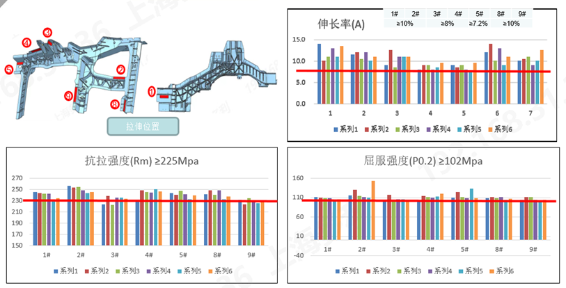 ③機械性能,由于該產(chǎn)品使用CSMET C611鋁錠,屬于免熱處理材料,項目認可階段根據(jù)零件不同的區(qū)域定義不同的延伸率要求,而抗拉強度和屈服強度按照客戶定義的標準執(zhí)行。