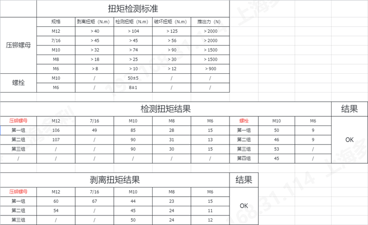 壓鉚螺母擰緊扭矩、剝離扭矩、破壞扭矩以及推出力都滿足標準要求。 綜合以上實驗結(jié)果:
