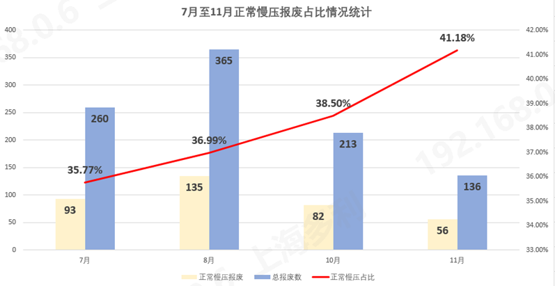從優(yōu)化的理論和實踐的結(jié)果可以看出,該優(yōu)化是具備可行性的。 后續(xù)我們跟客戶進行了溝通,將實驗報告以及結(jié)論進行了匯報,得到了客戶的同意。 04 熱模慢壓件優(yōu)化后報廢情況 從7月份至11月,生產(chǎn)零件數(shù)量29233件,報廢件數(shù)量共974件,其中熱模件報廢共366件,占比37.6%,較上半年減少20個百分點。