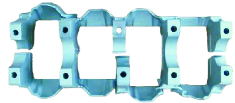 ![]() 原標題:發動機主軸承座壓鑄件的開發與實踐 主軸承座零件外輪廓尺寸為410 mm×184 mm×87 mm,產品質量為3.36 kg,三維示意圖見圖1。主體部分有5個壁厚為22~24 mm的支撐梁,梁中心有直徑為?55 mm的半圓面,每個半圓面兩側有兩個直徑為?10 mm的螺栓過渡孔。產品底部有帶加強筋的不規則形狀結構的薄壁環繞,將5處支撐梁連接為一體。鑄件一般壁厚為4 mm,過渡圓角R為3 mm,起模斜度為1.5°。通過對鑄件的形狀及結構分析,發現鑄件呈框架式結構,壁厚不均而且局部存在厚大,鑄造工藝性不佳。零件的技術要求是軸承座在基準墊壓緊下最小載荷為6.7 kN,氣孔規范執行ES1S7G-6F098-AA。 由于主軸承座的主要功能是支撐發動機曲軸,并保證曲軸的正常運行,因此必須保證軸承座的內部鑄造質量,才能滿足軸承座達到功能要求的抗拉強度和疲勞試驗。但由于主軸承座鑄件存在嚴重的壁厚不均,在受力最大的支撐梁處,鑄件壁厚大于20 mm,壓鑄過程中極易產生縮孔缺陷,這是壓鑄過程需要解決的難點。