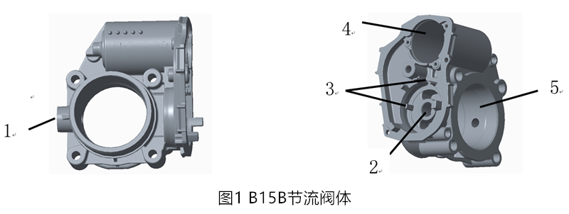 ![]() 1、左側節氣門軸孔 2、右側節氣門軸孔 3、齒輪箱彈簧限位小柱子 4、電機孔 5、進氣孔環帶 文章介紹B15B閥體產品結構,模具結構以及生產過程中出現的問題,運用模流分析,對模具的進料系統及排溢系統做了分析改進,解決了節流閥體在生產過程中出現的問題,有效降低了產品廢品率。 B15B產品零件結構 B15B節流閥體零件(圖1)。最大外形尺寸107 mm ×103 mm × 63 mm,最小壁厚為1.7 mm,最大壁厚為5 mm,平均 壁厚為3 mm,質量約為400g。該產品在齒輪箱側有2處彈簧限位小柱子, 最小端只有1.3 mm,高度為9 mm。 模具設計方案 模具結構見圖2,鑄造工藝圖見圖3。1模1件,采用3個滑塊,考慮到滑塊尺寸較大,3個滑塊均為油缸抽芯。橫澆道通過右側鑲塊,合金液沿橫澆道從右側滑塊底部進料口進入型腔。設計使用4000kN壓鑄機,采用φ60mm沖頭。