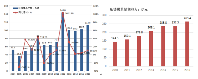 圖1. 2001-2020我國模具銷售額及增長情況 壓鑄模具行業發展情況 壓鑄是在高壓作用下,使液態或半液態金屬以較高的速度充填壓鑄模具型腔,并在壓力下成形和凝固而獲得鑄件。我國壓鑄模具企業快速發展起步于上世紀90年代初,主要以摩托車配件壓鑄模具開始,進入新世紀后,隨著中國汽車工業的快速發展,國內部分龍頭壓鑄模具企業加大了先進、大型裝備及先進檢測設備的投入,以生產汽車支架、離合器、油底殼、手動變速器等中型壓鑄模具為主,帶動了全國壓鑄模具企業快速發展,模具制造水平及制造工藝大幅提升。目前,我國壓鑄件的產量早已居世界第一位,壓鑄模具開發周期、生產水平都有了顯著提升,壓鑄模在產量和產值上僅次于沖壓模及塑料模,已不僅能滿足國內大型、精密壓鑄模具的需要,還能向歐美等傳統壓鑄模具強國出口。2016年我國壓鑄模具行業銷售收入為263.4億元,約占我國模具制造業總銷售收入的15%。圖2顯示我國壓鑄模具產量較2004年翻了一番,盡管產量(套數)略有波動(甚至下降),但總體銷售收入以9%的增速增長,顯示壓鑄模具正在經歷產業升級,往高端化、大型、精密壓鑄模具發展。