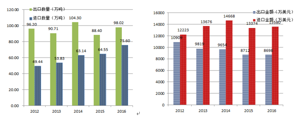 壓鑄模具出口情況 本世紀伊始全球模具市場開啟了新一輪增長,2005年全球模具市場規模為681億美元,2017年已超過1300億美元。當前,我國壓鑄模具出口主要集中在歐洲、北美、日本、韓國等地,個別企業出口模具量已占總產值70%以上。伴隨著汽車工業的高速發展,與其相關的需求擴大了發達國家向我國壓鑄模具市場的采購,使中國迅速成為全球汽車壓鑄模具需求增長的新引擎,每年自用和出口壓鑄件超過500萬t。尤其是我國加入WTO后,開放力度加大,與國外合作頻繁,鑒于國內人力成本的優勢,國外環保要求等諸多因素,大量壓鑄件已轉移到中國生產,使國內一部分壓鑄模具企業初步具備生產中等質量及以上模具的水平。這些壓鑄模具的共同特點是:制作精良、精度極高、定制化設計、使用壽命和鑄件質量達到國際先進水平,同時具有較為明顯的價格優勢,但高端工業領域,大型、復雜、精密模具進口需求仍然較高。圖3為2012~2016年我國主要壓鑄模具進出口數量與金額。可以看出過去若干年我國出口模具的總數量遠高于進口,但以銷售收入計算的出口模具金額明顯低于進口金額,體現我國整體出口模具的檔次和價格仍較進口偏低。