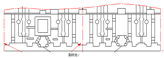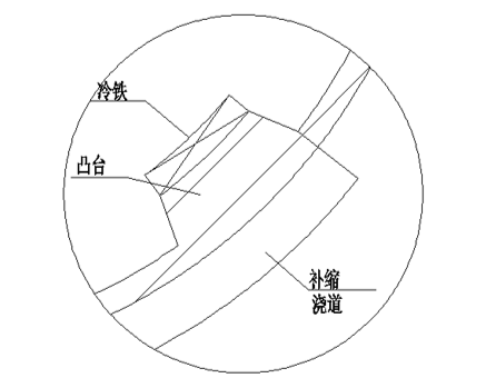 圖3:鎂合金殼體冷鐵布置示意圖 在工藝設(shè)計(jì)時(shí),在凸臺(tái)部位一般都設(shè)置冷鐵加強(qiáng)激冷以減小熱節(jié),但當(dāng)凸臺(tái)過厚時(shí)容易產(chǎn)生疏松缺陷,即使增加冷鐵厚度也很難消除。在凸臺(tái)部位設(shè)計(jì)補(bǔ)縮澆道增加補(bǔ)縮,可有效消除疏松缺陷。 澆注溫度 降低澆注溫度可減輕鑄件過熱,有利于降低疏松等級(jí),但不是溫度越低越好,溫度過低會(huì)降低補(bǔ)縮效果。一般情況下,當(dāng)澆注大直徑立筒時(shí)可適當(dāng)降低澆注溫度,澆注小直徑立筒時(shí),澆注溫度要適當(dāng)提高。 澆注工藝 在保證鑄型充滿的前提下,充型速度一般選下限,既可以避免充型時(shí)產(chǎn)生紊流、飛濺造成卷氣,又能延長(zhǎng)金屬液對(duì)澆道的烘烤時(shí)間,從而調(diào)整鑄件凝固速度,強(qiáng)化順序凝固效果。根據(jù)生產(chǎn)經(jīng)驗(yàn),升液速度要高于充型速度。 增加保壓壓力可以強(qiáng)化合金凝固期間補(bǔ)縮能力,從而填充枝晶間的微縮孔,但壓力過大會(huì)導(dǎo)致鑄件變形、粘砂和跑火等,因此壓力也不是越大越好,一般保壓壓力為30kPa~60kPa。 2、偏析的產(chǎn)生和防止 鎂合金的偏析一般是成分偏析,常會(huì)導(dǎo)致鑄件直接報(bào)廢。合金熔煉工藝和鑄件凝固條件都會(huì)引起鑄件產(chǎn)生偏析缺陷。通過調(diào)整精煉溫度、改善激冷能力以及降低澆注溫度,可有效降低偏析缺陷產(chǎn)生傾向。 精煉溫度 鎂合金熔煉過程中,相對(duì)鎂合金熔點(diǎn)高的其他金屬是重金屬。重金屬元素偏析的現(xiàn)象是由于重金屬元素未能完全融入合金液中,提高精煉溫度,重金屬元素能夠更好地熔入合金液中,鑄件中重金屬元素的偏析現(xiàn)象明顯減少。 激冷能力及澆注溫度 成分偏析易產(chǎn)生于厚壁冷鐵間隙處和厚壁間的薄壁處,在這些部位放置石墨砂加強(qiáng)激冷,減輕局部過熱可有效防止偏析缺陷的產(chǎn)生。降低澆注溫度,縮短合金凝固時(shí)間,降低合金過冷度,防止重金屬在凝固過程中析出,減輕了偏析的產(chǎn)生。在耐熱鎂合金殼體的生產(chǎn)中,降低澆注溫度,偏析缺陷得到了極大改善。 3、裂紋的產(chǎn)生和防止 裂紋是鑄件致命的鑄造缺陷,在鑄件上呈現(xiàn)直的或者曲折的隙縫與裂口,斷面處被氧化呈黑色或者深灰色,易產(chǎn)生在凸臺(tái)的厚薄交接處和下端框處,工藝設(shè)計(jì)、原材料質(zhì)量和冷鐵位置都會(huì)導(dǎo)致裂紋缺陷。 工藝設(shè)計(jì) 當(dāng)鑄件設(shè)計(jì)多個(gè)相鄰較近的凸臺(tái)時(shí),見圖4,在凸臺(tái)間的薄壁處易產(chǎn)生裂紋缺陷。通過設(shè)計(jì)合理的防裂拉筋,可有效消除裂紋缺陷。