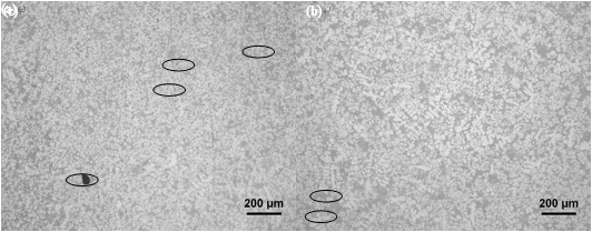 圖4首次試制得到鑄件的不同部位的壓鑄態力學性能 根據鑄件本體的力學性能結果,對1號、3號、5號和6號位置取樣并進行OM觀察,見圖5。可以看出,所有位置的晶粒尺寸基本一致,其組織由細小的α-Al和共晶組織組成(見圖5c)。但1號、5號和6號部位試樣存在明顯的氣孔,尺寸從十幾μm到幾十μm不等(圓圈內所示),而3號部位試樣的顯微組織則未發現明顯的氣孔,這與模擬分析及X射線檢測的結果一致。氣孔是鋁合金壓鑄件常見的缺陷,其不僅使鑄件的有效受力面積減少,還會造成鑄件局部應力集中而成為裂紋源,最終嚴重降低合金的伸長率,一些不規則氣孔的出現,還會使合金的抗拉強度下降。
