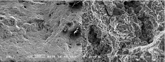 圖6減震塔不同部位斷口形貌。(a)3號低倍,(b)3號高倍,(c)5號低倍,(d)5號高倍 改進方案及力學性能測試 根據首次減震塔力學性能測試及缺陷分析,確定鑄件整體的屈服強度相當,抗拉強度略有變化,而伸長率差異較大,導致力學性能較差,主要是該部位存在氣孔和夾渣等缺陷。真空壓鑄時,氣孔產生與鋁液除氣不充分導致含氣量較高、模具設計不合理導致氣體排出不暢、壓鑄工藝參數設置不合理如壓射速度過快造成卷氣、真空閥開閉時間不合理、鑄件壁厚差異過大及脫模劑不合格等因素有關;夾渣產生的主要因素歸結為熔體精煉時除渣效果不好、鋁液自由表面氧化造渣、模具設計不合理導致排渣不完全等。對本試驗中鑄件來說,影響氣孔大小的因素主要與熔體含氣量、型腔本身真空度及模具本身設計有關,而夾渣則與鋁液存在流動死角或渣包尺寸太小有關。 為此,主要通過以下幾個方面來改進:①加寬5號位置的澆道,使其保證鋁液流動時,較為順利地填充側壁的位置;② 加大1號位置的渣包尺寸,使鋁液的夾渣和氣體盡可能排入渣包中;③ 進一步降低熔體中的含氣量,保證熔體溫度在690-700 ℃之間;④改進模具密封性,從而進一步提高壓鑄時型腔內的真空度,使其真空度保持在5×103 Pa以下。 圖7是改進方案后壓鑄生產的減震塔進行本體取樣的力學性能數據。由圖7可知,所有位置的壓鑄態伸長率均超過7.9%,遠高于要求的5%以上,這為為后續熱處理進一步提高力學性能奠定了良好的基礎。