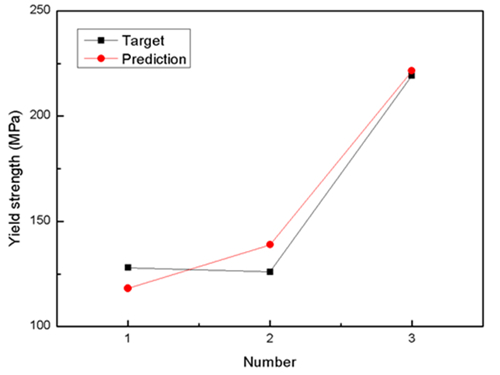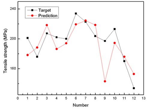 3.2、模型驗證分析 使用訓練學習所得的模型參數(shù),對4項力學性能試驗中未參與機器學習的實驗樣本,進行了計算,將計算結(jié)果與試驗結(jié)果做對比,見圖1,Target表示實際值,Prediction表示預(yù)測值。
