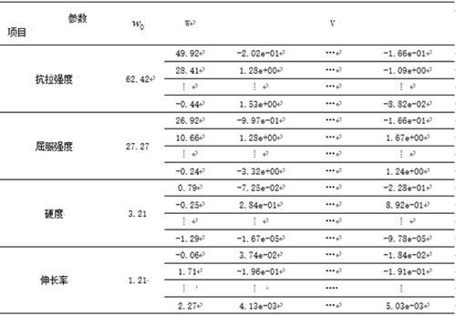 三、試驗結(jié)果與討論 3.1、模型參數(shù) 抗拉強度、屈服強度、硬度及伸長率的模型參數(shù)是機器內(nèi)部自動學習計算而得。訓練開始前初定模型參數(shù),第一次使用樣本的元素含量及初定的模型參數(shù)計算預(yù)測結(jié)果,根據(jù)實際值計算預(yù)測值與實際值的均方誤差,隨后模型依據(jù)學習率改變參數(shù),使均方誤差減小,不斷往復(fù)直至整體樣本訓練3000次,最終得出的模型參數(shù),見表2。 表2:擠壓鑄造鋁合金機械學習模型參數(shù)