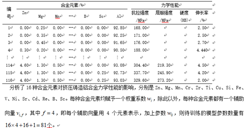結(jié)論 (1)基于FM算法和梯度下降原則,構(gòu)建了多項式回歸模型,使用現(xiàn)有擠壓鑄造鋁合金研究結(jié)果,依據(jù)誤差逐步減小的原則進行了機器學習訓練,得到了合金元素與擠壓鑄造鋁合金力學性能的模型參數(shù)。 (2)利用未參與計算的試驗樣本,對機器學習模型的計算結(jié)果進行了驗證,結(jié)果表明,模型可以較好地預(yù)測擠壓鑄造鋁合金的力學性能;對計算誤差進行了分析。分析表明,微量合金元素影響和伸長率預(yù)測準確度尚需要進一步開展研究。 (3)對于材料加工過程工藝參數(shù)對力學性能的影響,如壓力條件,熱處理等,仍可用類似的方法,建立其權(quán)重參數(shù)的相關(guān)模型,并基于大量的試驗數(shù)據(jù)進行訓練。結(jié)合元素含量的機器學習模型,有望建立起較完整的力學性能預(yù)測模型。