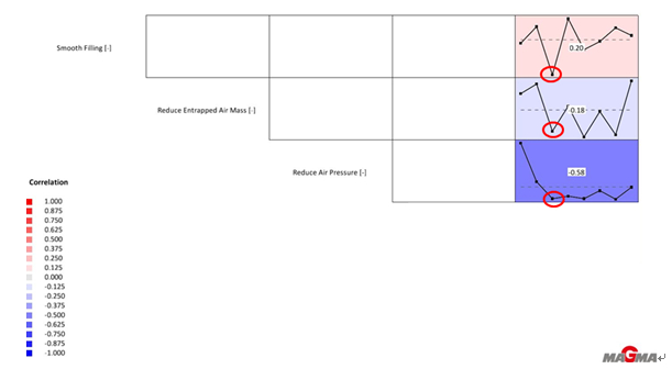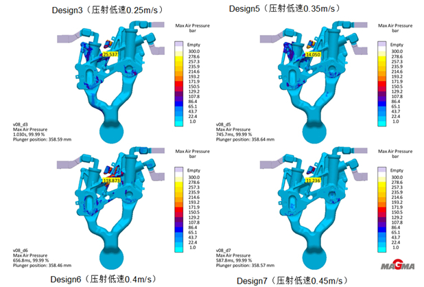 圖2:油冷器剖視圖 二、虛擬填充選擇最佳的壓鑄低速 由于鋁合金高壓鑄造過程中的壓射低速階段的低速參數很難精確地掌握,試制過程中僅憑經驗對參數進行調整,導致廢品較多,工藝穩定性差。結合Magma軟件對鋁合金高壓鑄造過程進行模擬填充,確定低速參數,可以避免壓鑄工藝參數調整的盲目性,減少調試廢品,穩定壓鑄工藝。 1、虛擬試驗工藝參數設定及優化 運用MAGMASOFT 模擬汽車零件油冷器的填充成型,根據同類型產品的經驗,設定模擬的常量條件:采用4000 kN壓鑄機,澆注溫度為660°C,定模溫度為150°C,動模溫度為150°C,壓室溫度為180°C,壓室的有效距離為395 mm,鑄造壓力為78 MPa,高速位置為237 mm(內澆口),高速速度為4 m/s,噴涂4 s,吹干3 s,壓射延時2 s,合模3 s。 設置以降低氣壓(Reduce Air Pressure),減少卷氣(Reduce Entrapped Air Mass),提高填充的光滑性(Smooth Filling)為優化目標。填充光滑性是MAGMASOFT軟件特有的模擬結果判據指標。簡單地說填充光滑性數值越小,越填充性能越好。 設置多組低速參數進行優化模擬,低速數值范圍在0.15~0.5 m/s之間,步長設定為0.05 m/s。軟件對輸入的低速工藝參數自動排列組合,生成8個方案及模擬結果,見表1。 可以看出Design5(低速0.35m/s)、Design3(低速0.25m/s)、Design7 (低速0.45m/s)、Design6(低速0.40m/s)效果最佳,為備選方案。 通過分析DOE綜合性指標曲線圖(見圖3)和 DOE綜合性指標趨勢圖(見圖4),從減低氣壓、減低卷氣的指標觀察,Design3(低速0.25 m/s)、Design5(低速0.35 m/s)、Design6(低速0.40 m/s)、Design7 (低速0.45 m/s)比較接近。從備選方案的模擬氣壓結果分析(見圖5),Design3鑄件的最高氣壓為2.554 MPa,Design5鑄件的最高氣壓為1.405 MPa,Design6鑄件的最高氣壓為11.887 MPa,Design7鑄件的最高氣壓為1.124 MPa,Design6鑄件氣壓分布最差,其余方案區別不大。從備選方案的模擬卷氣結果分析(見圖6),Design3鑄件的最高卷氣為54.35 μg,Design5鑄件的最高卷氣為63.08 μg,Design6鑄件的最高卷氣為757.95 μg,Design7鑄件的最高卷氣為135.09μg,Design6鑄件的卷氣最差,Design3與Design5的卷氣情況最好。但考慮到填充性能,選擇填充性能最好(光滑性數值最?。┑腄esign3(低速0.25 m/s)作為壓射低速階段的低速參數。
