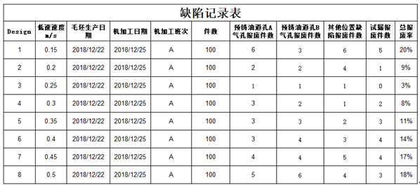 圖6:備選方案填充100%的卷氣圖 2、最優解的驗證 通過8種低速方案試制的缺陷數據統計,選用識別出的最優解即Design3壓射低速階段的低速0.25 m/s作為鑄造工藝參數,在實際生產中得到的鑄件品質良好,總報廢率為3%,見圖7及圖8缺陷記錄表。選用其余的低速方案得到的鑄件,在預鑄油道孔A與B的管壁有不同程度的氣孔缺陷,見圖9。