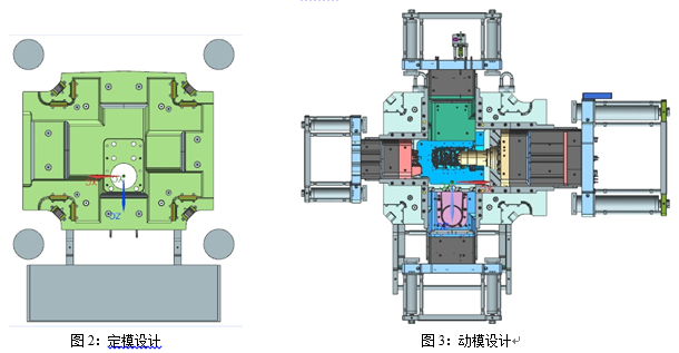 根據鎖模力計算結果和公司壓鑄機臺資源,選擇IDRA的37 000 kN壓鑄機。 K=G/(ρπR2L) =46.7% 式中,G為澆注質量,g;K為壓室充滿度;R為壓射沖頭半徑,cm;ρ為鋁合金密度,g/cm3;L為空壓射有效長度,cm。 壓室充滿度計算結果46.7%,符合標準30%~75%范圍要求,壓鑄機選型可行。 2、壓鑄模具設計 內澆口設計應該使鋁液的充型過程距離盡可能短,以減少鋁液溫度的降低;澆口位置應該使鋁液到達型腔各處位置距離相等,實現遠離部位同時充填和凝固;應該設置在壓鑄件厚壁處,以實現順序填充、壓力補縮。根據該產品的結構特點、高內部質量要求和金屬液填充流向的需要,澆注系統采用扇形設計,澆口厚度為5 mm,位于產品壁厚5 mm分型線位置,設置在下滑塊上。澆注系統設計見圖1,模具設計見圖2和圖3。