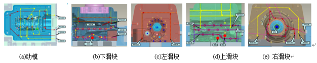 圖13:軸承孔縮孔位置及大小 原因是缺陷位置屬于最后充填位置,模具溫度較低,容易產生縮孔。針對產品小端軸承孔縮孔,重點是控制模具溫度,措施如下。 (1)通過使用模溫機來進行模具溫度平衡控制。動模設計W11、W12 兩組;下滑塊設計W30、W31 兩組;左滑塊設計W40 一組;上滑塊設計W60、W61 兩組;右滑塊設計W70、W71 兩組,模溫機設定模具溫度為220±10 ℃,回油溫度為170±10 ℃。實際使用時,需要模具上模完成后,打開模溫機進行預熱,全部直冷、點冷暫不開,約1 h模具回油溫度達到標準后,開始增壓高速熱模。模溫控制設計見圖14。