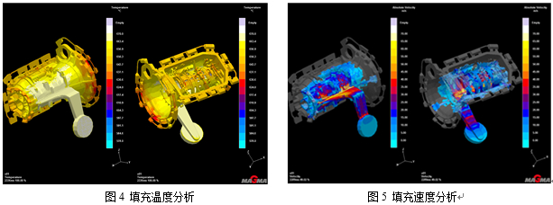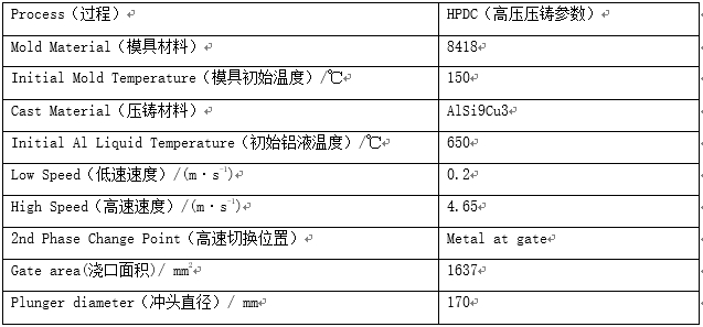 3、模流分析 為了提高模具方案設計的合理性,按照符合實際的壓鑄工藝參數及邊界條件進行各個階段的參數定義,通過Magma軟件進行模流分析。模流分析工藝參數見表1。