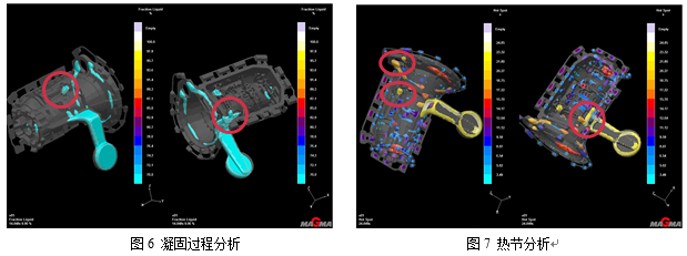 表1:模流分析工藝參數表 圖4為填充溫度分析。可以看出,型腔100%填充后,鑄件整體的溫度在620~640℃,均高過液相線溫度578℃,鑄件因鋁液溫度下降出現冷隔的風險較小。圖5為填充速度分析。,可以看出,鑄件在內澆口的速度值約為55 m/s,符合設計要求。圖6為凝固過程分析。凝固過程中的溫度場變化,顯示了從料餅到關鍵部位的補縮路徑,孤島區域在25%以上,容易有縮孔。表明孤島區域有縮孔風險。圖7為熱節分析。可以看出鑄件內部存在局部厚大區域,容易形成熱節。圖8為縮孔分析。可以看出熱節處容易產生縮孔,可以應用點冷工藝加強冷卻或擠壓工藝增加鋁液的補縮。通過工藝分析,選擇高壓冷卻水冷卻工藝。