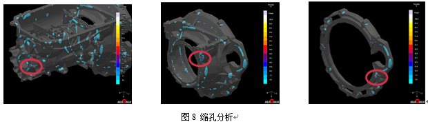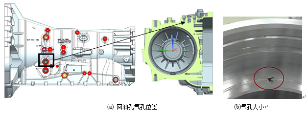 4、壓鑄工藝參數 壓鑄工藝參數選擇是:低速壓射速度為0.2±0.1 m/s;高速壓射速度為5.5±0.5 m/s;高速距離為550±10 mm;增壓距離為650±10 mm;澆注溫度為660±10℃ 5、機器人自動取件 因為產品凈重為15.18 kg,澆注系統質量為9.32 kg,采用機器人取件。取件手由3部分組成,分別是左側的三爪卡盤定位機構、右側的氣缸連桿夾緊機構和下方料柄抓緊機構組成。首先,左側的三爪卡盤伸進制品左側的圓孔內,并撐開漲緊,固定產品位置。 其次,右側連桿夾緊機構通過外面的兩個支撐柱頂住產品,2個仿形夾爪通過2組氣缸進行夾緊。2個仿形夾爪的夾緊位置選擇在工件的2個加強筋位置,防止了工件變形的可能。 最后,料柄抓緊機構通過下方平行氣缸夾緊料柄,平行氣缸上方裝有帶導軌的軟浮動機構,可以保證在夾緊料柄的同時自動對準料柄的中心。 二、壓鑄缺陷分析及改進: 產品油冷器回油孔直徑為14 mm,深度為6 mm,采用密封圈進行密封,要求孔內腔表面氣孔直徑小于0.4 mm,間隔大于8 mm,數量小于3個。實際試制發現,縮孔尺寸為2 mm×1.5 mm×2 mm,嚴重超標,比例達到90%,會導致產品泄漏。縮孔缺陷位置及大小見圖9。