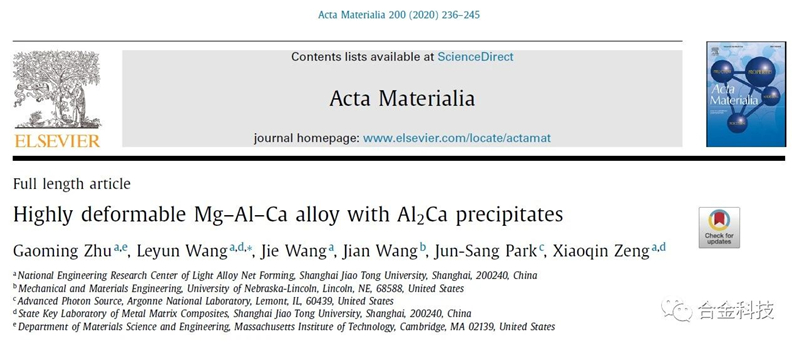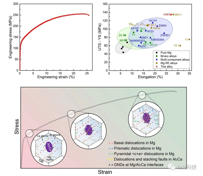 上海交通大學材料學院的研究人員采用Al和Ca兩種常見合金元素,設計了一種新型的鎂合金AX61(Mg-6Al-1Ca, wt.%)。在250℃擠壓條件下,AX61合金中析出了一種亞微米級尺寸的Al2Ca相,其晶體取向呈隨機分布。這些Al2Ca析出相一方面阻礙鎂基體中的位錯滑移,提高材料的加工硬化率。另一方面,Al2Ca析出相本身具有類似面心立方的晶體結構,可以在其{111}晶面上形成位錯和堆垛層錯而啟動塑性變形。Al2Ca相的內部塑性有效消除了局部應力集中,使材料能夠保持高延伸率。Al2Ca相的析出還間接抑制了脆性的Mg2Ca和Mg17Al12相的生成。此外,溶質Al和Ca抑制孿晶形核,同時促進了 由于上述機制,AX61合金的室溫延伸率高達27%,加工硬化量(以拉伸強度和屈服強度之差表示)可達135MPa。上述性能組合高于已知的所有鎂合金。這種具有超高可加工性的新型AX61合金無需使用昂貴的稀土元素,通過普通的擠壓工藝一步成型,因此其生產成本很低,有很好的實際應用前景。