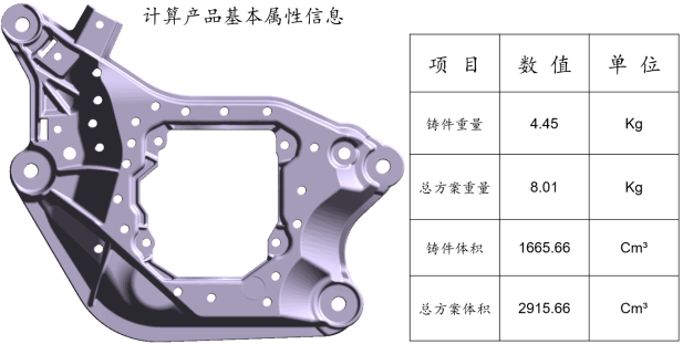 圖1:橫梁產品結構圖 2.前期計算與分析 在產品前期開發階段,將毛坯3D導入MAGMASOFT?,軟件可自動計算出包含產品體積,重量,截面積,投影面積等在內的基礎數據,然后進一步計算出生產該產品所需要的壓鑄機臺噸位并與軟件機臺數據庫對應的機臺相匹配,如圖2所示。