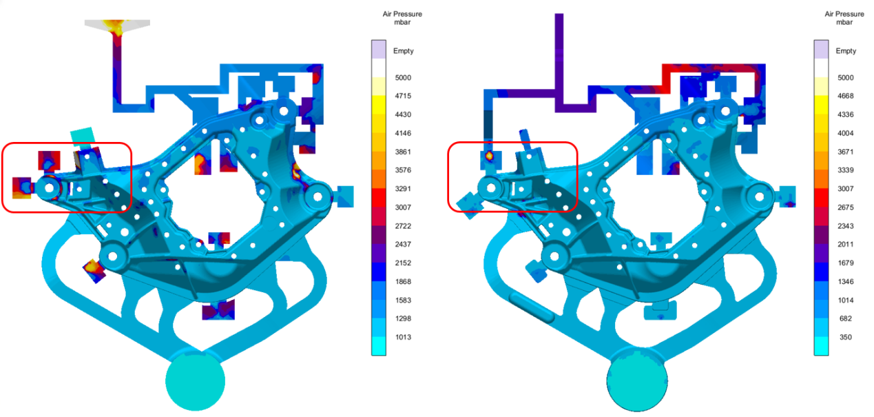b.初始澆排系統 圖6:充型流態與排溢系統 3.3 排溢系統優化 在確定初始排溢系統后,再次進行流動模擬,發現現有的排溢系統不夠完善,產品末端存在高氣壓,見圖7a所示。高氣壓區域有非常大的氣孔風險,將會嚴重的影響產品成型,焊接和裝配。于是根據模擬結果優化排溢方案,在高氣壓區增加排氣道來降低氣體聚集的風險,見圖7b所示。實際生產中需要輔以真空工藝,按照此工藝設計基礎,再次模擬,觀察和對比優化前后的產品氣壓分布,發現增加排氣道及增加真空工藝后,原高氣壓區域的氣壓值由5000mbar降為1000mbar,結果顯示高氣壓問題得到有效的改善,詳見圖7。