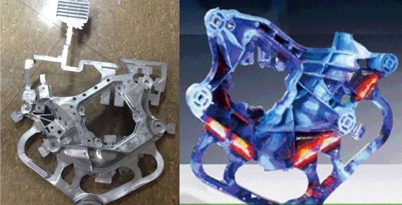 圖9:首試的鑄件圖 6.小結 本文以壓鑄鋁合金橫梁的開發過程為例,通過使用MAGMASOFT?將開發過程可視化,透明化。通過這種方式可以提前預測產品將會出現的問題,并在方案前期進行改善措施,以此減少試模次數。通過對橫梁的澆排系統及壓鑄工藝參數的DoE優化,以軟件推薦的最優方案為指引進行試制,產品首次試制就達到了量產的狀態,最大限度的節約了成本,壓縮了開發周期。
