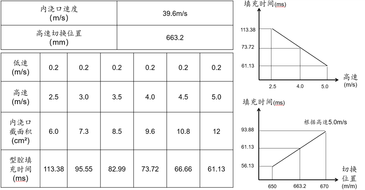 圖2:基礎數據計算表 在壓鑄機臺確定后,用戶根據產品的結構特點輸入產品平均壁厚,MAGMASOFT?會計算出包含料管充填率,低速,高速切換位置,高速,內澆口截面積,充型時間,內澆口速度等在內的全部工藝參數。軟件也將會根據此數據推薦出最佳的成型時間,成型時間與低速,高速切換位置,高速,內澆口截面積等數據相關聯。使用者可以根據工廠機臺的實際性能,輸入不同的參數,然后軟件將會生成內澆口截面積和內澆口速度等參數數據庫,此數據庫可稍后用來進行工藝參數的優化計算,見圖3所示。