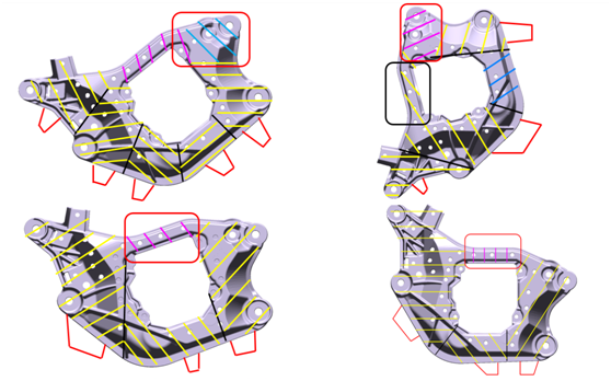 圖3:工藝參數計算表 3.澆排系統分析 3.1 澆注系統選擇 根據軟件計算出來的內澆口截面積,再結合產品結構,將所有的進澆可能性方案全部導入軟件。圖4為不同位置進澆分析,其中黃色線為各自的填充區域,由黑線間隔,粉色線和藍色線為融合金屬液填充區域。其中對4個方案進行分析和判斷如下:方案1共五個澆口,澆口分布均勻,進澆平衡,可實現整體進澆。壓力也相對傳遞均勻,保證致密度。需注意最末端填充區域,有冷料堆積充填與排氣不良風險。方案2共三個澆口,產品大體積區域對應大澆口,保證充填質量與壓力傳遞。但厚大澆口容易造成局部溫度過高,引起變形及對模具形成不良影響。同時此擺放位會拉長充填行程。方案3共三個澆口,產品大體積區域對應大澆口,保證充填質量與壓力傳遞。但厚大澆口容易造成局部溫度過高,引起變形及對模具形成不良影響 。方案4共三個澆口,產品大體積區域對應大澆口,保證充填質量與壓力傳遞。但厚大澆口容易造成局部溫度過高,引起變形及對模具形成不良影響。