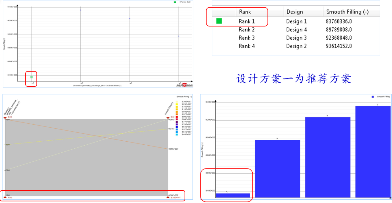 c.氣壓對比分析圖 圖7:排溢系統優化和優化模擬結果對比 4.DoE工藝參數優化 在確定好澆排系統之后,還需要對壓鑄工藝參數進行設計和計算。MAGMASOFT?的自主優化工具,使得工程師能通過了解工藝變量對鑄件質量的影響,更為省時省力地探索更大的設計空間,進而找到最優的壓鑄模具和工藝布置方案。與傳統模擬不同,自主模擬只需要工程師設定一次模擬,但是,很多模擬運行將覆蓋全部工藝窗口。該軟件自主地挑出可能的設計,進行分析并采用統計數據方式匯總所有結果。 基于澆排系統設計完成的基礎之上,借助DoE自主優化工具進行壓鑄工藝參數的優化。高速速度是影響鋁液填充和產品質量的關鍵參數。以高速速度的DoE優化過程為研究對象,進行分析。設定高速速度在3.5-4.0m/s之間,迭代步長設定為0.1,以降低澆口速度及減小冷隔缺陷為目標對象。通過軟件進行大數據分析與統計后,推薦出最佳成型工藝參數,選擇高速速度3.5m/s既可以滿足澆口速度低,降低模具充蝕,又可以保證產品的質量。詳見圖8所示。