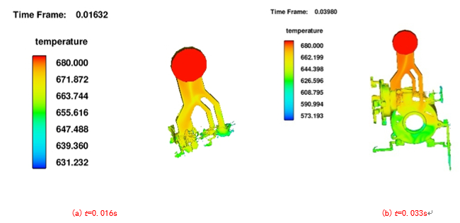 圖5:原始工藝方案 2、數值模擬與優化 2.1 數值模擬 將原始壓鑄方案導入FLOW-3D軟件中進行數值模擬,圖6為原始方案流場分布結果。通過模擬結果可得,壓鑄件最高溫度為680 ℃,最低溫度約為603 ℃。型腔內金屬溫度隨著與內澆口距離的增大,其溫度大致呈逐漸降低的狀態。溫度決定凝固的順序,溫度較低的位置首先凝固,溫度較高的位置凝固較慢。充型過程較不平穩,在t=0.027 s時發生液滴飛濺現象。綜合分析得到,在模擬過程中,壓鑄件凝固方式為逐層凝固,并且按照遠離內澆口的方向先凝固的順序,所以能夠及時得到補縮,故而不會出現較為嚴重的縮松縮孔。