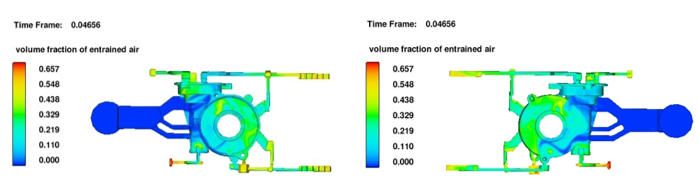 圖7:卷氣分布模擬結果 根據模擬結果來看,壓鑄件表面缺陷最高處達到7.3%左右,但處于排溢系統上,而鑄件主體大部分表面質量低于2%,基本不會影響鑄件的使用。再結合圖7發現,在表面缺陷最嚴重的位置的卷氣量也很高。因此判斷表面缺陷的產生和鑄件內的卷氣量有著很大的關系。因此想要改善表面質量,則需要從卷氣量來入手,進行優化方案的設計。