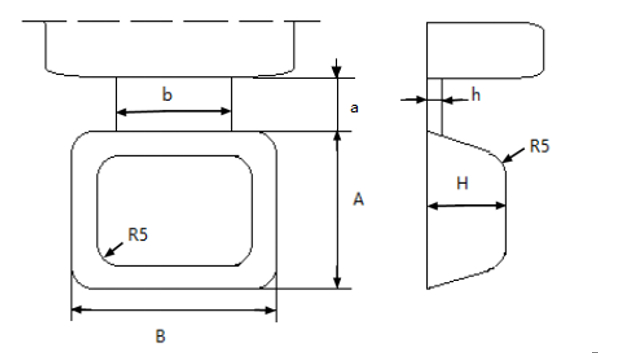 圖4:溢流槽形狀 其中,b、a、h、A分別為溢流口的寬度,長度、厚度,長度。B、H分別為溢流槽的寬度以及厚度。 選用一個此形狀溢流槽具體尺寸為:A=16 mm,a=6 mm,H=7 mm,h=1mm,b=12 mm,B=20 mm;考慮到零件特點,在零件中間增設一個圓形溢流槽。圓形溢流槽尺寸:R=15 mm,H=12 mm,b=12 mm,a=6 mm,h=1 mm。圖5為原始工藝方案。