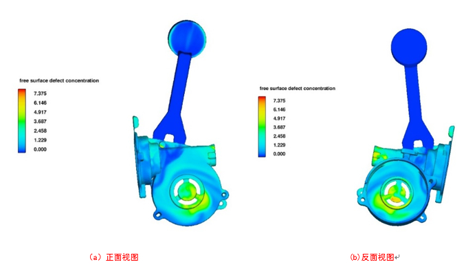 圖8:表面缺陷模擬結果及分析 2.2 工藝優化 原始壓鑄方案卷氣較嚴重,需要進行工藝優化,正確選擇澆口的位置和導流方式,對于非良形狀的鑄件多采用多股內澆口,設置3個內澆口,內澆口寬度為8 mm、10 mm、20 mm。長度為5 mm,增加了內澆口截面積從而使得壓射速度提高。為了改善排氣條件,在鑄件兩側增設環形溢流槽,溢流槽1尺寸為A=5 mm,H=8 mm,B=15 mm;溢流槽2尺寸為A=10 mm,H=10 mm,B=15 mm, 溢流槽3尺寸為A=5 mm,H=8 mm,B=15 mm吊耳處增設溢流槽,尺寸為A=15 mm,H=10 mm,B=20 mm,同時設置一個圓柱形冒口,R=10 mm,H=15 mm。為了增加排氣效果,改善卷氣,在鑄件端蓋處增加排氣槽。排氣槽用于從型腔中排出空氣及涂料揮發產生的氣體。為了使型腔中的氣體在壓射時盡可能多的被金屬液排出,將排氣槽設置在金屬液最后填充的位置。優化工藝的三維圖見圖9。