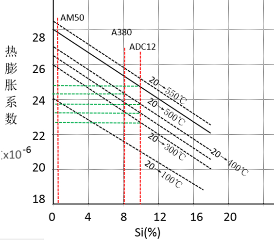 圖1:模具材料的溫度與熱膨脹系數(shù)之間的關(guān)系 1.2.鋁合金鎂合金的熱膨脹系數(shù): 壓鑄鋁合金、鎂合金的熱膨脹系數(shù)主要和Si含量有關(guān)。同一溫度情況下Si含量越高,熱膨脹系數(shù)越小.圖2為3種常用壓鑄材料ADC12,A380,AM50的熱膨脹系數(shù),豎線是該材料成分需求的中值。壓鑄廠家可以根據(jù)自己公司的常用Si含量進行對應(yīng)查詢熱膨脹系數(shù)。