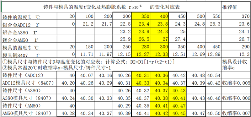 圖3:模具的熱成像溫度 2.2模具鋼材料和壓鑄合金材料熱膨脹系數(shù)在不同的溫度下對應(yīng)表: 常用的3種壓鑄材料為ADC12,A380,AM50的熱膨脹系數(shù)見表1。以壓鑄鋁合金ADC12(熔點580℃)為例,模具材料選擇8407.壓鑄件在模具內(nèi)的溫度t ℃從550℃開始下降到500℃,450℃,400℃,一直到室溫20℃時,分別對應(yīng)的熱膨脹系數(shù)r 為25.3,24.8,24.3,23.8等至常溫時定義為0。對應(yīng)于鑄件的溫度,模具鋼8407的溫度分別為450℃,400℃,350℃,300℃(較鑄件低100℃)時的熱膨脹系數(shù)為12.89,12.69,12.51,12.33等。