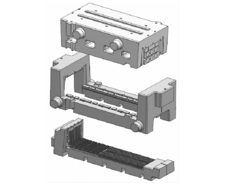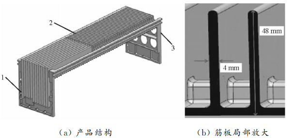 圖1:產品結構及筋板局部放大圖 1.左側板 2.底板 3.右側板 2、鑄造工藝設計 鑄件結構復雜,主體壁厚薄,高度超過200 mm,充 型過程困難,采用重力鑄造可能在底板處憋氣,溫度下 降太快,導致鋁液流動性變差,從而出現澆不足缺陷。采用低壓鑄造工藝,該澆注方式具有充型過程平穩、卷 氣傾向小、鑄件內部致密等特點。 根據鑄件結構特點,設計兩種澆注方案,都從鑄件 底板兩側多點進澆,同時起補縮作用。鋁液經過橫澆道 降速,穿過側面冒口進入型腔,保證澆注系統溫度高于 型腔溫度,實現順序凝固。內澆口設置在底部幾何中心,使鋁液充型對稱平穩,方便低壓澆注時進行定位,并利用CAE模擬分析優選出合理的方案。 2.1 方案1 圖2為鑄造工藝設計方案1,鑄件“C”口朝上,由于 兩個側面中間無結構,為防止鑄件應力變形,設計3根加強筋,熱處理后去除。在加強筋上設置10處出氣口,其截面尺寸為5 mm×20 mm,總截面積為1000 mm2。