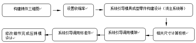 圖1:筆記本電腦后蓋三維圖 2、壓鑄設備與模具設計參數 使用CAD集成系統進行三維實體造型,也可以使用其他專業造型軟件(UG-NX、Pro/E)進行造型后導入CAD集成系統。通過系統的手冊查詢和相關的尺寸計算模塊,可以計算出鑄件的體積和質量。鑄件的體積為46.8cm³,質量為85.2 g,投影面積為123 m㎡,模具型腔為一模一腔。澆注系統和溢流槽的總體積為55.4 cm³,質量為100.8 g,可以計算鎂合金熔液總澆注質量為186 g,壓鑄機所需的最小鎖緊力為1 012 kN,選擇J1118H(180t)1800 kN臥式冷室壓鑄機,最大鎖緊力為1 800 kN,壓鑄電機座板行程為350 mm,注射力為200 kN,一次金屬注射量為(鎂合金)700 g,能滿足生產需要。 3、基于大數據分析的鎂合金壓鑄模快速設計系統 壓鑄模設計的主要工作是模具工作零件的創建,包括型腔、斜滑塊、澆注系統、頂出機構等。首先基于大數據分析結構優化,建立鑄件的三維模型,設定鎂合金材料的收縮率,基于大數據分析引導設置,設置模具分型面,自動生成模具工作零件,調用鎂合金壓鑄模標準模架和標準件,修改細節,完成設計。 3.1 流程設計 壓鑄模設計流程:①建立三維圖;②系統引導建立模具工作零件,包括設定收縮率、分型面設置、模具凹凸腔、周邊斜滑塊、中心澆注通道和分流通道設計;③系統引導調用標準模架和標準件,最終設計點澆口、頂出機構以及壓鑄模加熱和冷卻系統,具體流程見圖2。壓鑄??焖僭O計系統大大節省了數據查詢和三維建模的時間,基于壓鑄件缺陷的大數據分析可以盡量避免大量缺陷產生。將傳統壓鑄模設計周期從18天縮短為1天左右,大大節省了壓鑄模設計時間,提高了設計效率。
