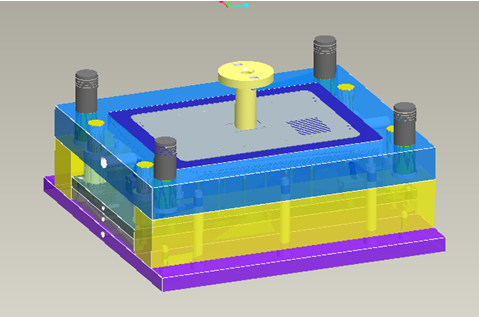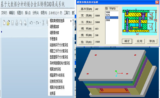 圖5:鎂合金壓鑄模CAD集成系統標準零件調用界面 3.6 壓鑄模三維總裝圖 根據系統引導,調用標準模架和標準件,再調用壓鑄模的工作零件。修改模具細節后,完成壓鑄??傮w設計,三維總裝圖見圖6。壓鑄??傮w設計完成后,經模具運動干涉檢查確認后,結合大數據分析進行壓鑄模整體結構審查驗證,對壓鑄模細節進行優化,修正,對后期壓鑄模試??赡艹霈F的問題進行預判,排除因壓鑄設備以及壓鑄工藝造成壓鑄件缺陷的其他設計因素,有條件的廠家可以進行運動仿真以及充型過程模擬,分析模擬結果后,再對壓鑄模整體結構進行優化,確認整體無誤后,方可進行下一步數字化制造,以保證在后期壓鑄模試模中一次性成功,節約設計加工成本。模具設計在系統的指導下逐步計算和調用,無需對各個零件進行重復的模具建模和裝配,避免了大量的重復工作,大大縮短了模具設計時間。