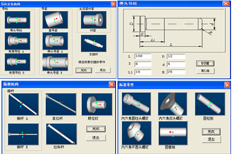 (a)CAD集成系統 (b)標準模架調用界面 圖4:鎂合金壓鑄模CAD集成系統及標準模架調用界面 3.5 標準零件調用 選擇“調用零件庫”按鈕,該按鈕有三個子菜單,即導向定位機構、脫模機構和標準件,見圖5。選擇其菜單按鈕,調用用戶操作界面,然后選擇所需部件的圖標。將顯示“零件參數輸入”對話框。輸入參數后,單擊“創建”生成所需的零件。點擊菜單按鈕“調用零件庫-導向定位機構”顯示的用戶界面,點擊導柱圖標顯示的操作界面。