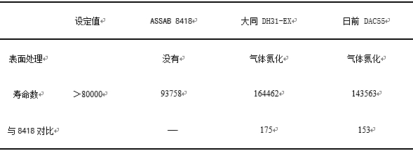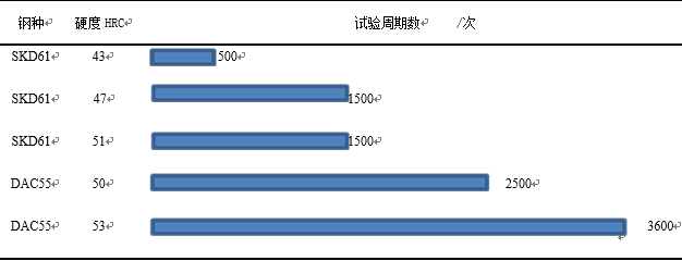 表2:兩種鋼材不同硬度出現(xiàn)表面龜裂紋的模次 從表1可以看出,模具鋼硬度越高,抗熱疲勞強度越高,出現(xiàn)表面龜裂紋的模次就越高。因為模具鋼硬度越高,韌性就越低,在模具殘余應力集中位置就容易出現(xiàn)大開裂。為此,試驗另一種表面處理工藝,在保證模具鋼內(nèi)部韌性的前提下,提高表面硬度來提高模具鋼抗熱疲勞強度,見圖2。