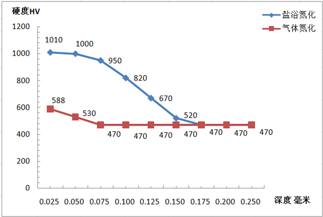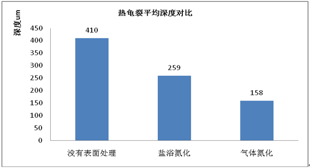圖2:兩種表面處理工藝的硬度值圖 從圖2得知,鹽浴氮化的硬度會大于氣體氮化,理論上鹽浴氮化出現(xiàn)表面龜裂紋的模次會大于氣體氮化的。分別用未處理試樣、鹽浴氮化試樣和氣體氮化試樣做冷熱交替循環(huán)試驗,材料是H13鋼,從表2可知出現(xiàn)表面龜裂紋的最大模次是3600,因此試驗的模次設定為5000。試驗結(jié)果見圖3和表3,發(fā)現(xiàn)沒有表面處理的試樣龜裂紋的平均深度及最大深度都是最大;氣體氮化試樣龜裂紋的平均深度及最大深度都是最少。表3顯示鹽浴氮化試樣出現(xiàn)表面龜裂紋最早;氣體氮化試樣出現(xiàn)表面龜裂紋最遲。鹽浴氮化出現(xiàn)表面龜裂紋的模次小于氣體氮化;表面龜裂紋的平均深度及最大深度也比氣體氮化深。原因是鹽浴氮化表面出現(xiàn)0.01 mm的白層,產(chǎn)生應力集中。
