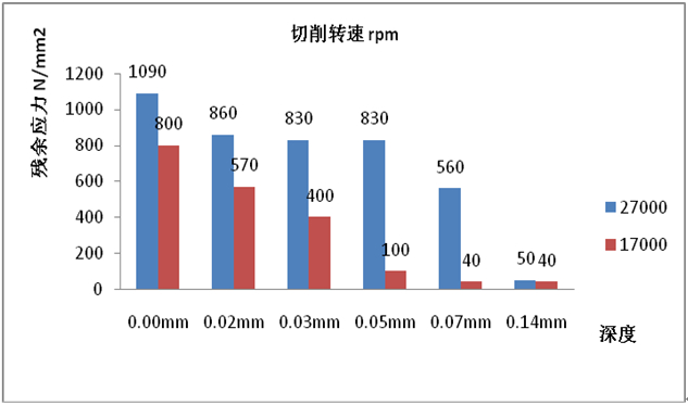 圖4:模具切削加工產(chǎn)生的殘余應力 對模具放電加工產(chǎn)生的殘余應力進行研究,得到的殘余應力數(shù)值,見圖5。原因是放電加工會在型腔產(chǎn)生白層,殘余應力數(shù)值較大白層深度只有0.11 mm,可以用研磨砂紙及油石手工拋光去除。